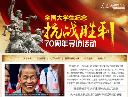 本次活動吸引了來自全國200多所高校的800支大學(xué)生團隊報名,大學(xué)生們尋訪抗戰(zhàn)老兵,聆聽抗戰(zhàn)故事,重走抗戰(zhàn)遺址,調(diào)研人文歷史,感悟革命精神。各團隊實踐期間在人民網(wǎng)強國社區(qū)大學(xué)生論壇實時播報實踐進程,發(fā)回稿件數(shù)千篇。浙江大學(xué)一位學(xué)生在實踐總結(jié)中說:“我們的活動通過人民網(wǎng)的平臺得到了更多媒體的關(guān)注,讓更多的人關(guān)注到關(guān)愛抗戰(zhàn)老兵行動,這個暑假沒有白過,真的很有意義!”