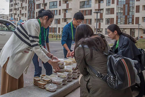 聽了介紹,更加渴望見到我們的大廚啦。劉芳總監(jiān)為我們提供了一個便利,讓我們趁大廚送飯的時(shí)候近距離接觸大廚。隨后我們來到世博村內(nèi)的送餐地點(diǎn),有幸看到兩位大廚正在給志愿者們分發(fā)盒飯。