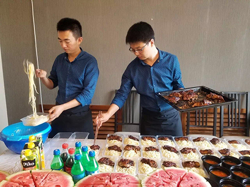 趁著兩位大廚張羅著分發(fā)盒飯的功夫,小編趕緊跟大廚交流起來。這兩位大廚分別是劉會彬和高德發(fā),都是名副其實(shí)的“90后”,別看年輕,兩位大廚的廚藝精湛,參與保障過青島國際啤酒節(jié)、國際象棋大賽等國際節(jié)慶活動及賽事。