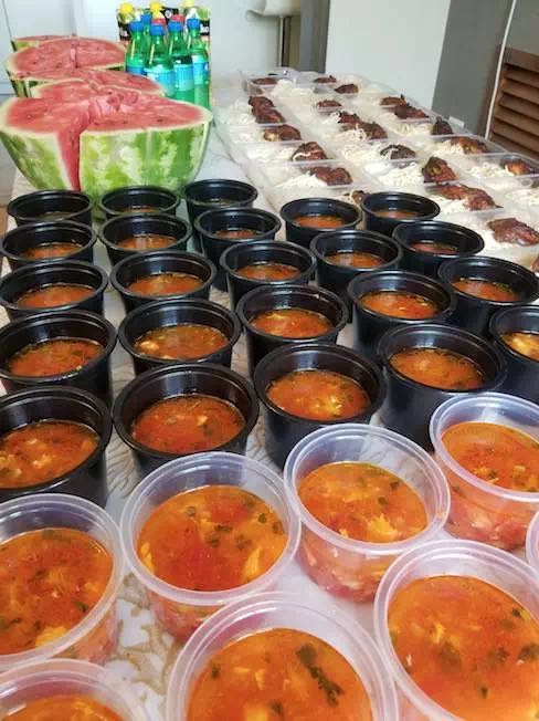 做好飯,就要忙著分盒飯,兩位大廚真是一點(diǎn)休息的時(shí)間都沒有。為了方便領(lǐng)取,兩位大廚從市場采購到專用飯盒,每次都精心包裝,水果、主食、菜品整齊有序擺放,像完成一件微雕工藝品那樣專注投入。