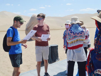 在敦煌的鳴沙山與月牙泉,兩名英國劍橋大學(xué)的大學(xué)生對“一帶一路”和“絲綢之路”概念的熟知程度令團(tuán)隊成員十分驚訝,外國青年對中國的文化歷史的濃厚興趣也令交流采訪十分順利和有趣。
