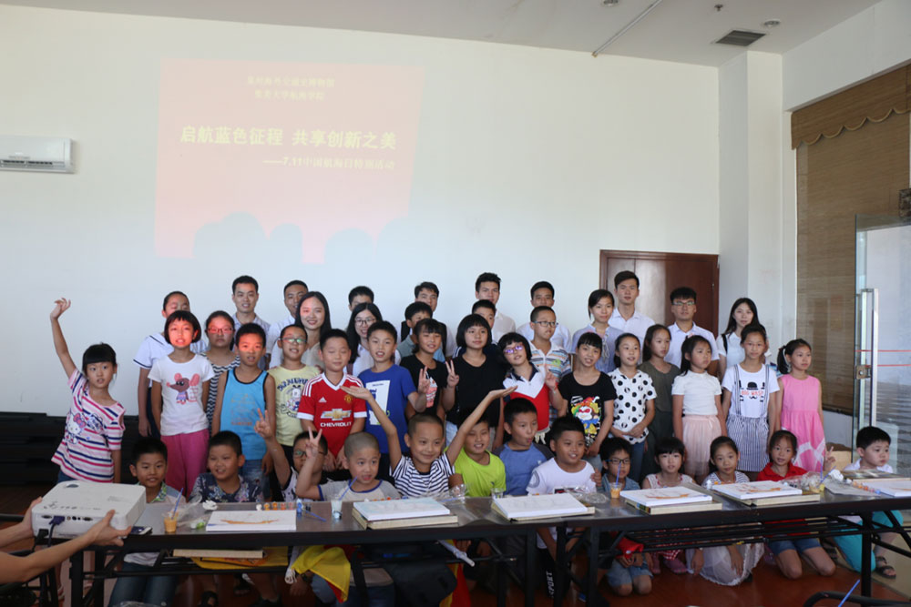 實踐隊與泉州海外交通史博物館共同開展了“啟航藍(lán)色征程,共享創(chuàng)新之美——7.11中國航海日”特別活動,向30位小朋友講解航海小知識,介紹古老的旗語和莫爾斯電碼等!跋M覀兊暮胶N幕軌騻鞑コ鋈,從娃娃抓起” 隊長胡栩禎說。