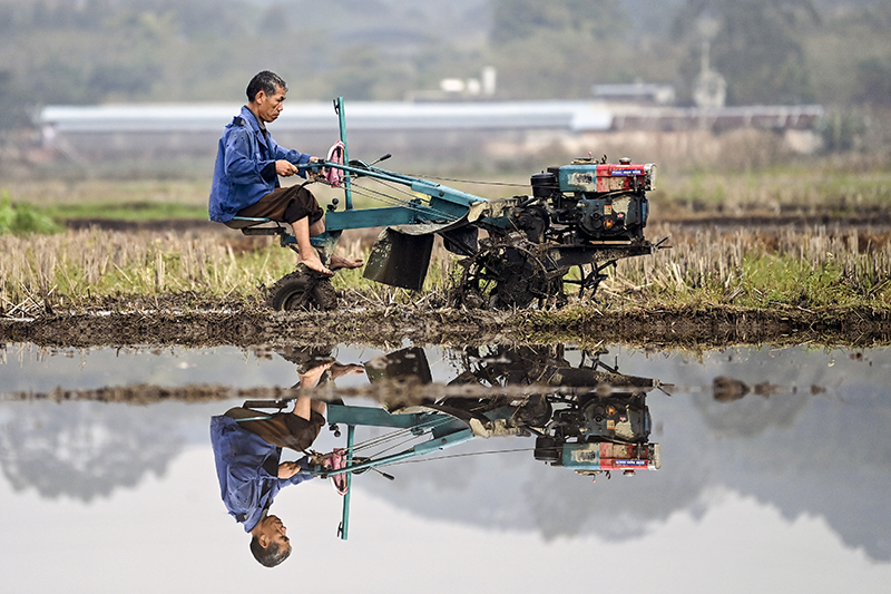 2月17日,廣西欽州欽北區(qū)大寺鎮(zhèn)農(nóng)民在翻耕稻田。新華社記者 張愛林?jǐn)z